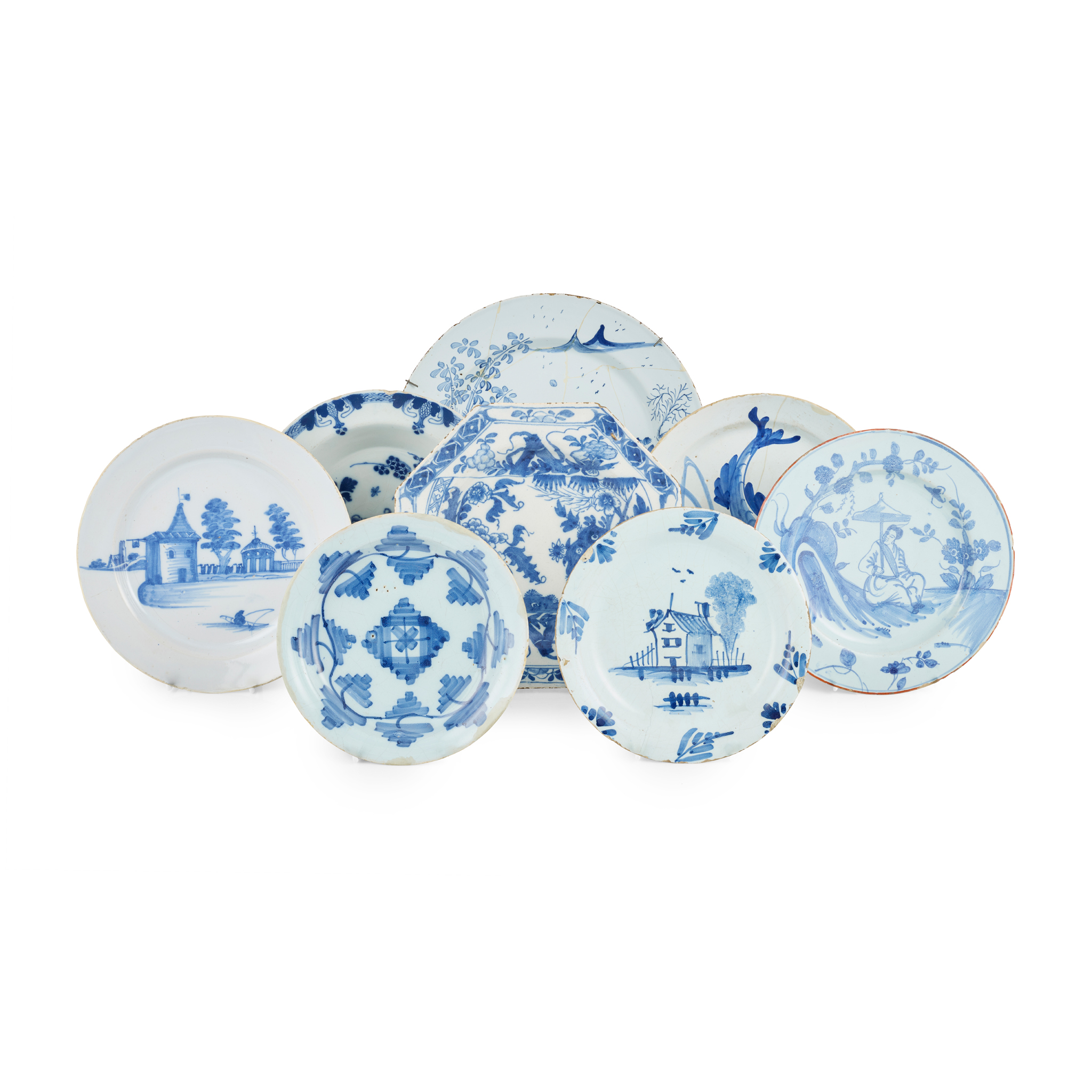 comprising one painted with a house with a sponged tree in the background, Mellor Collection label to the reverse; one painted with buildings and tree by the waterside with a boat in the foreground; an octagonal plate, possibly Bristol, with Chinoiserie decoration; a Bristol plate painted with whale spouting water; a plate with stylised geometric decoration; a shallow bowl decorated with peony and blossom issuing from rockwork; a Liverpool plate painted with a lady sitting under a parasol; and another with a figure in a chinoiserie setting (8)