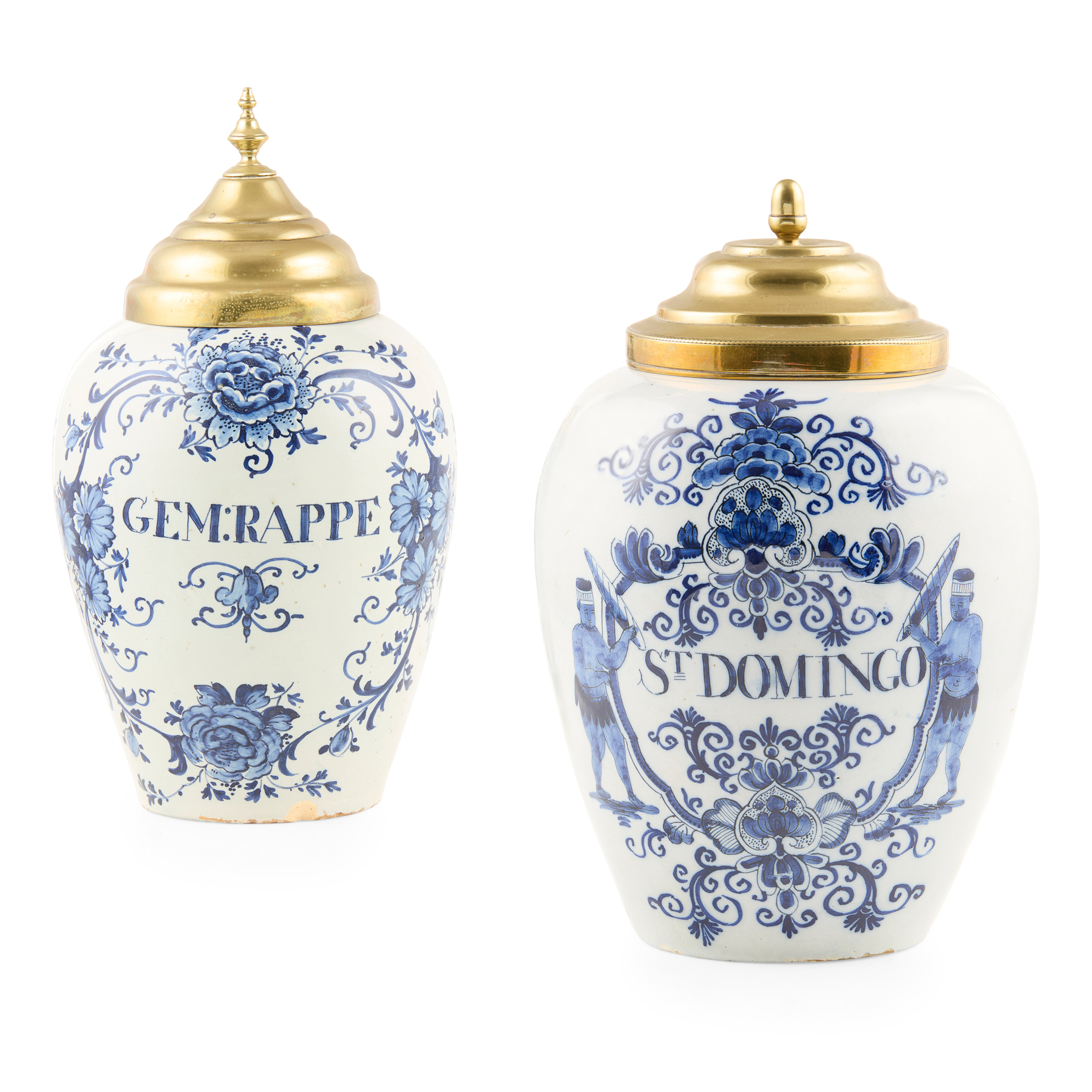 of ovoid form, one inscribed ‘GEM:GRAPPE’ within a cartouche enamelled with flowers and scrolling foliage, marked A PVMW (for the De Grieksche A factory), with a brass cover and knopped finial; the other inscribed ‘St Domingo’ within a cartouche enamelled with stylised scrolling foliage and flowers and flanked to each side by a native figure holding a cigar, the brass cover with acorn finial, marked with an incised V (2)