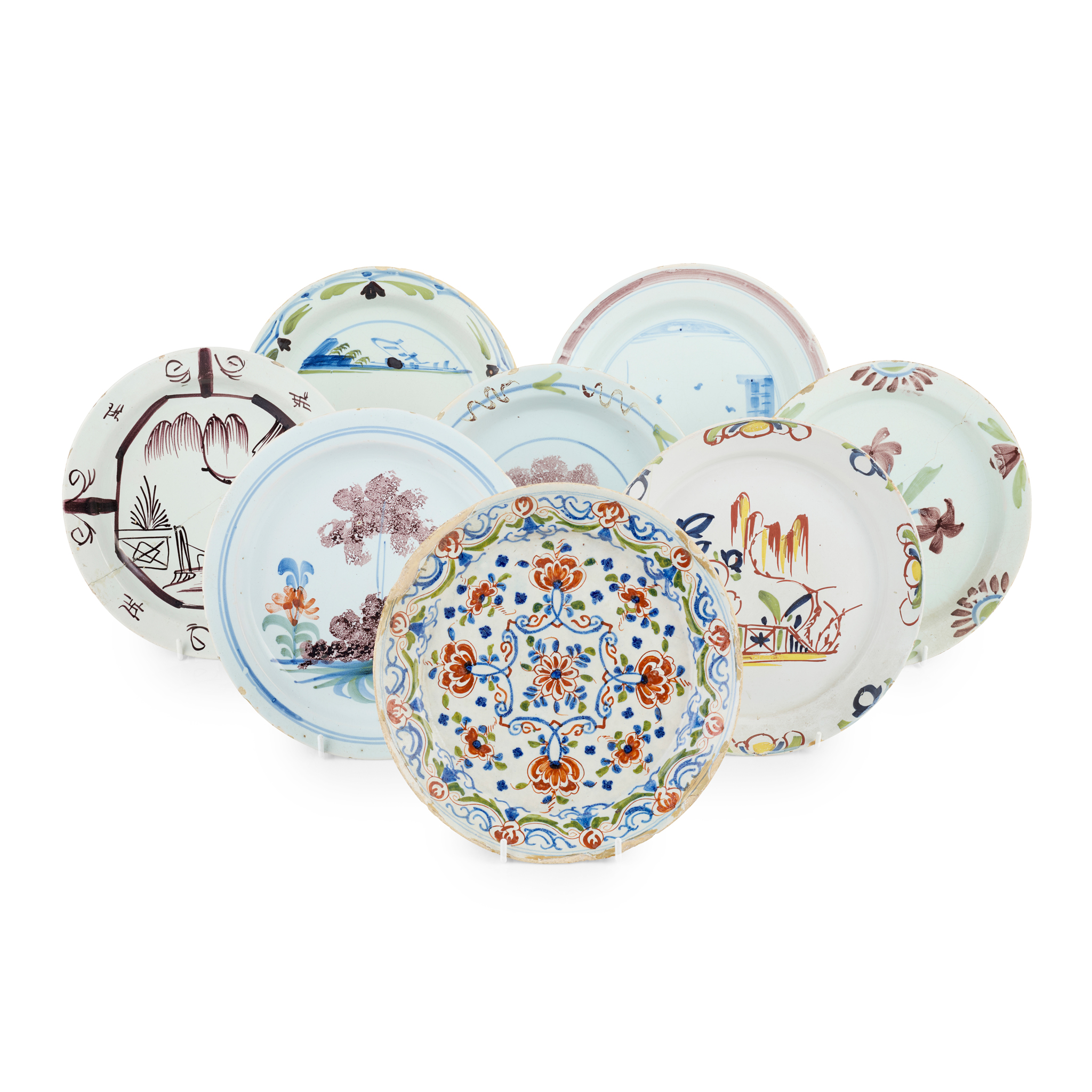 comprising a plate decorated with a sponged shrub in a pot, F H Garner label to the reverse; a plate with similar sponged foliate decoration with double concentric bands on the rim; a plate painted to the centre with a swan with a manganese band on the rim; a plate, probably Lambeth, painted in green, blue and manganese enamels with an architectural and landscape scene, with a stylised foliate border to the rim; a Lambeth plate painted to the centre with three flowers with stylised floral details on the border; a plate with overglaze enamel Chinese inspired decoration depicting a peony, weeping willow and fencework, Gary Atkins label to the reverse; and a Dutch plate profusely painted in blue, green and ochre with stylised floral designs, inscribed 5 to the reverse; and a plate painted in manganese with a weeping willow and foliage by the water, with stylised motifs and Chinese characters on the rim (8)