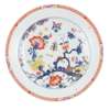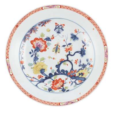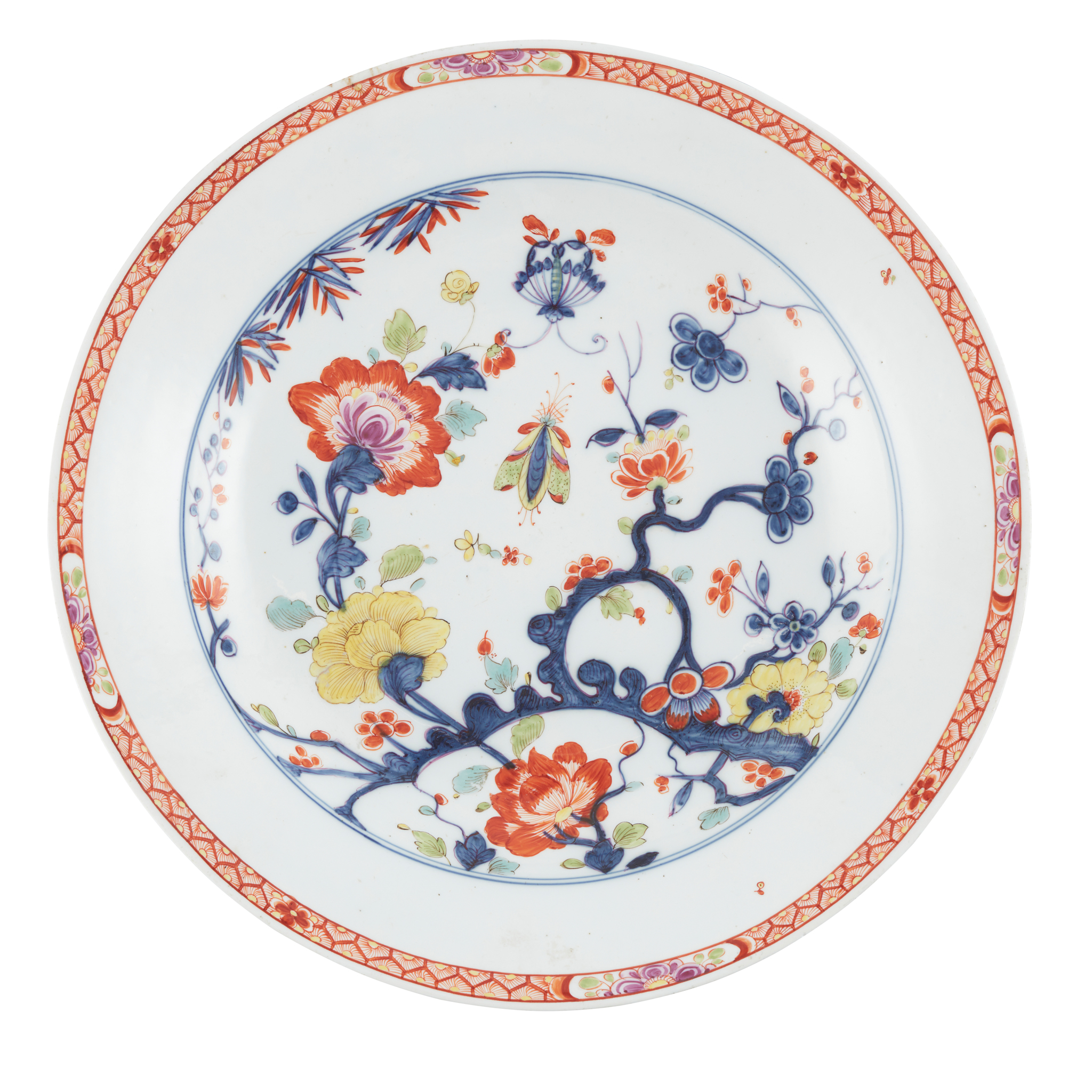 painted in underglaze blue and enhanced with polychrome enamels, decorated with a branch issuing peony flowers and foliage, bamboo leaves and prunus, with a butterfly and further winged insect, within concentric underglaze blue circles, the rim with an iron-red cell border incorporating four flower cartouches, crossed swords and the letter K to the reverse, the foot rim incised 3
