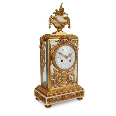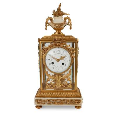 FRENCH WHITE MARBLE AND GILT BRONZE FOUR GLASS MANTEL CLOCK