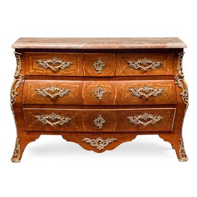 LOUIS XV TULIPWOOD AND BOIS SATINE MARBLE TOPPED BOMBE COMMODE