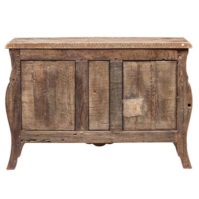 the serpentine breche violette marble top with a moulded edge, above three short drawers and a pair of long drawers with banded cartouches with foliate cast ormolu handles and escutcheons, above a shaped apron with an auricular foliate mount, the angles with pierced chutes with C and foliate scrolls, leading to splayed feet with sabots