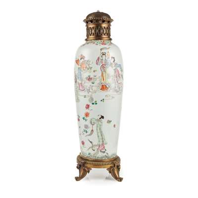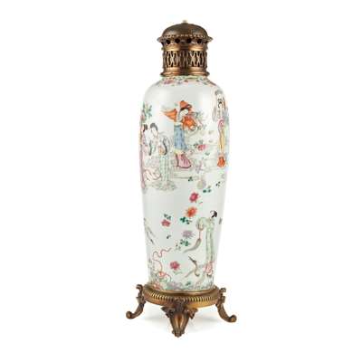 of slender tapering form, decorated with seven female heavenly figures standing on clouds above a field of cranes and flowers, one crane being ridden by another goddess holding a fly whisk; mounted on a gilt bronze base and cover; the base of the vase and rim removed, now mounted as a lamp