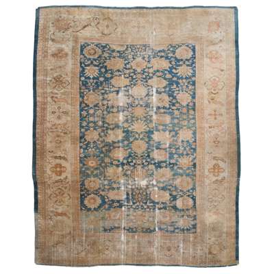 the light blue abrash field with allover palmette and vine pattern, within wide cream border