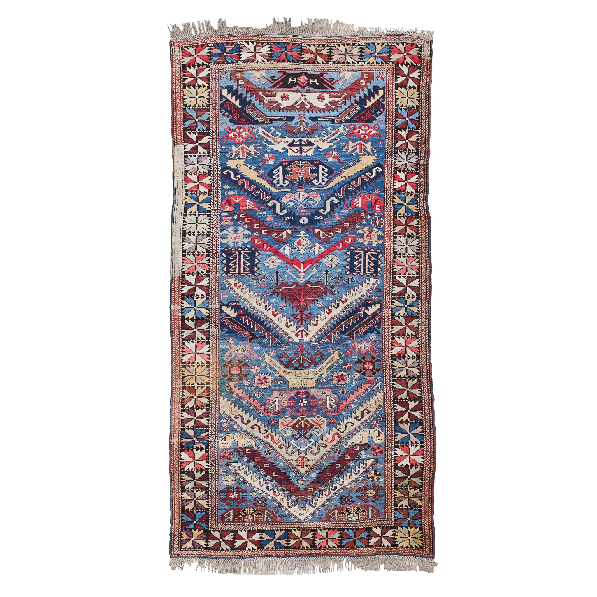 the abrash light blue field with polychrome serrated V pattern, within dark brown border
