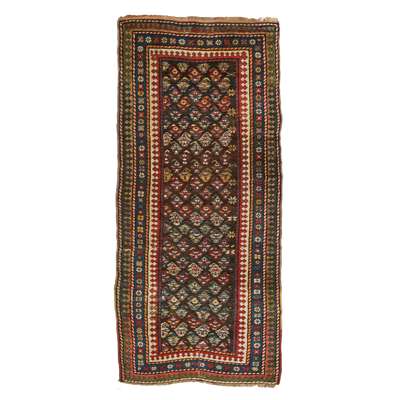 the brown field with allover boteh pattern, within narrow indigo border