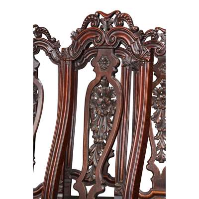 foliate carved pierced splat tops over light blue velvet stuffover seats, raised on scroll legs joined by scrolling H-form stretchers (6)
