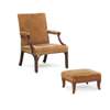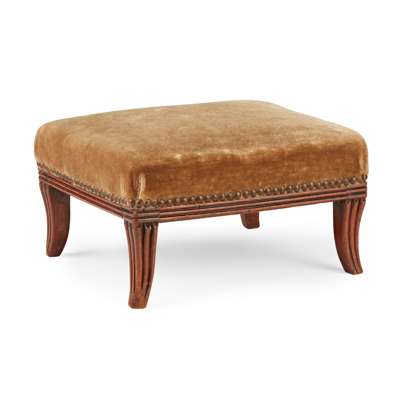 the square padded back above a stuff-over seat flanked by padded slightly serpentine arms with blind-fret carved curved supports, raised on straight legs with pierced brackets and leather castors; covered in cafe au lait plush upholstery with close nail trim; together with a LATE GEORGE III MAHOGANY FOOTSTOOL, on splayed feet, upholstered to match (2)