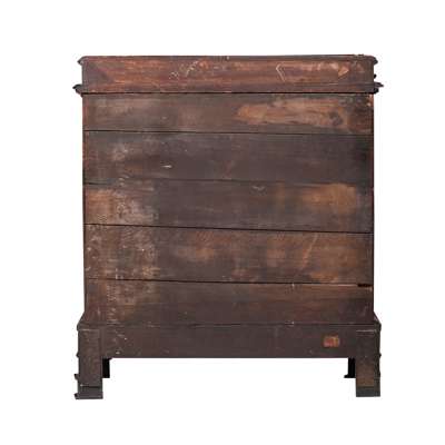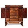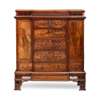 of breakfront outline, the fretwork and dentil moulded cornice above five drawers flanked by cupboards enclosing further drawers, on a later stand with a fret carved frieze and pierced bracket feet