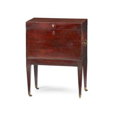 of cubic form, the hinged cover opening to a divided interior, with brass handles to the sides and raised on square tapered legs ending in brass caps and castors