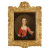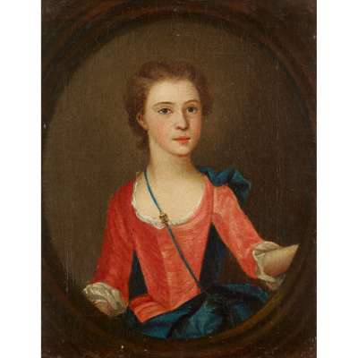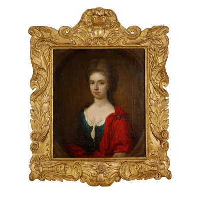 HALF LENGTH PORTRAIT OF A YOUNG WOMAN IN BLUE DRESS WITH RED CLOAK