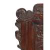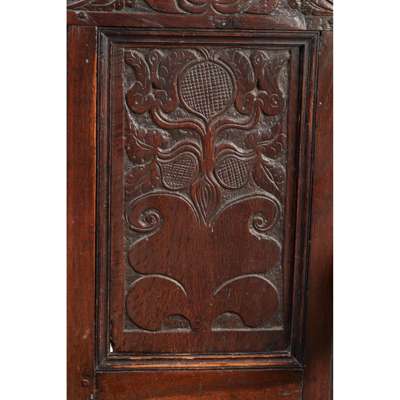 the scroll carved crest rail with stylised plant forms and leaves above a panel back carved with stylised tulips, over a plank seat flanked by shaped downward scrolling arms, raised on bobbin turned forelegs joined by peripheral stretchers