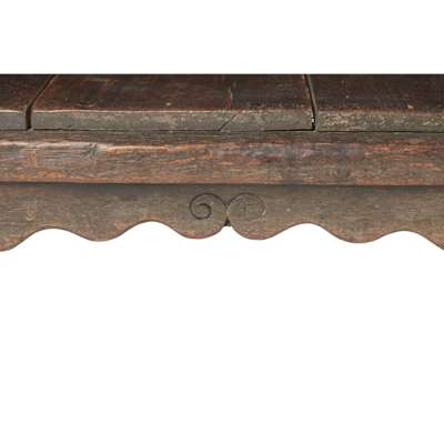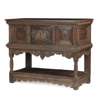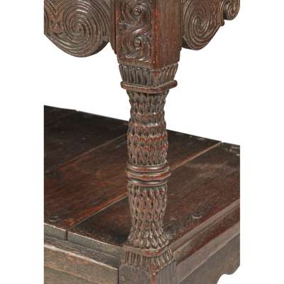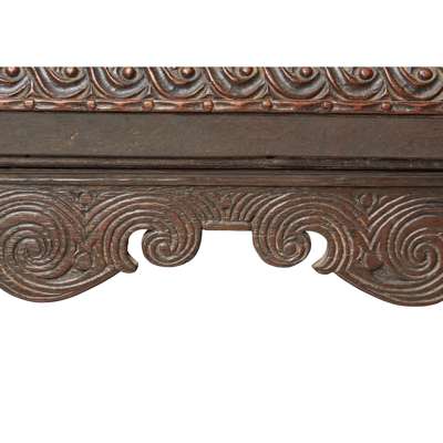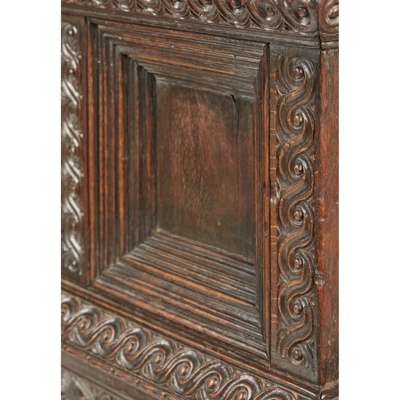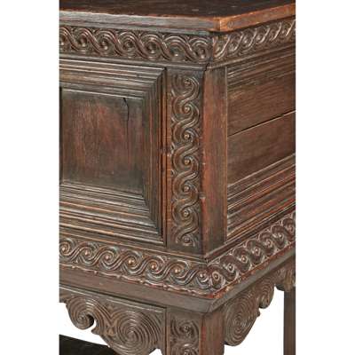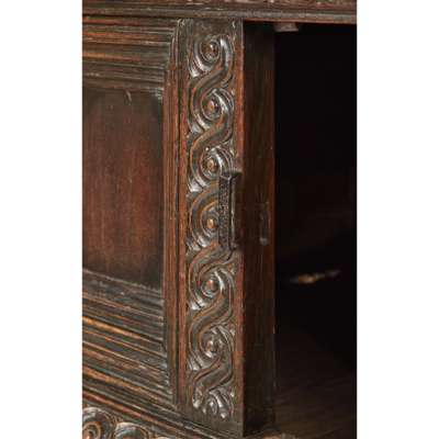 Note: The present cupboard shows close similarities to a well documented piece of early 16th century furniture illustrated in Percy Macquoid's, A History of English Furniture where it is called a credence cabinet. That cupboard was sold by Christies on March 8th, 2000. Most notable are the distinct chip-carved front supports and wavy apron which follow closely those on the cupboard illustrated by Macquoid and would suggest the two cupboards originate from the same workshop. The sinuous scrolled carving in the apron demonstrates a freedom which could be indicative of the move from the rigidity of Tudor period to the looser designs of the 16th century. The overall form relates to Franco-Flemish pieces, in particular the central drop-down pendant, and is not unlike the group of researched pieces which includes the Bretton Hall bed and sideboard at Temple Newsam, Leeds, thought to be possibly by a group of immigrant Flemish craftsmen.