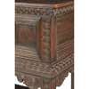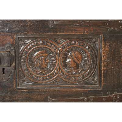 the moulded top with cleated ends above a guilloche carved frieze, over a central cupboard door with a carved panel with Romayne profile busts of a man and woman, flanked by deep moulded panels, and enclosed by further guilloche carving, above a wavy shaped apron carved with fine scrolling motifs and raised on and chip-carved baluster forelegs united by an open undertier, with a conforming wavy apron