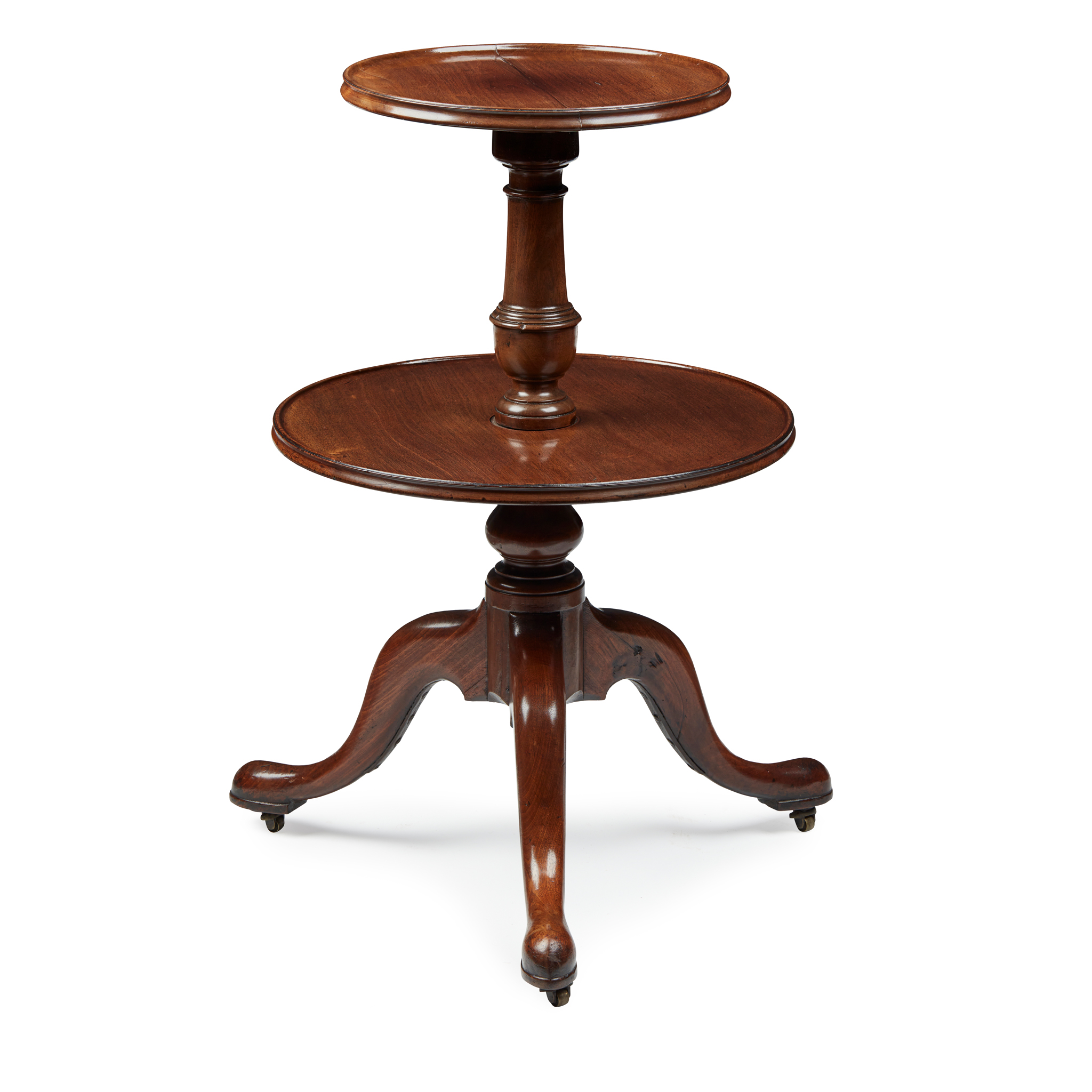 with two circular graduated tiers with moulded rims, raised on a ring-turned baluster support and tripod cabriole legs ending in pointed pad feet with brass castors