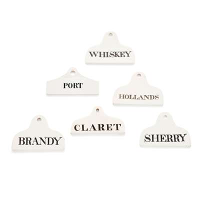 comprising three Spode examples SHERRY, WHISKEY, and BRANDY; another unmarked of matching shape, HOLLANDS; a Wedgwood Farrow & Jackson example, PORT; and an unmarked example, CLARET (6)