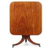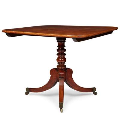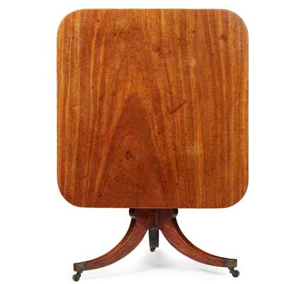 the rounded rectangular tilt top raised on a turned column with hipped sabre legs ending in brass caps and castors