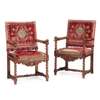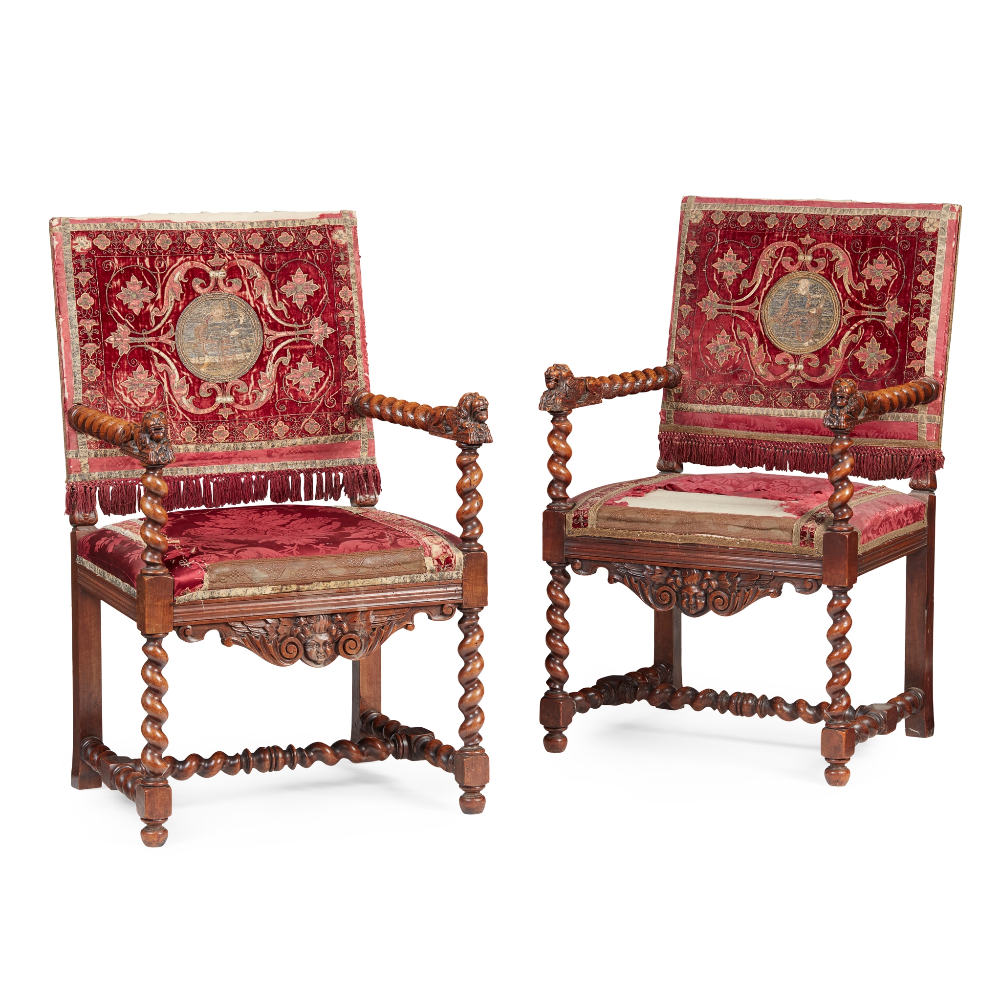 square backs covered in red velvet with metallic embroidered roundels depicting saints, over padded seats in red damask silk, flanked by barley-twist arms terminating in carved recumbent lions, raised on barley-twist legs joined by stretchers (2)