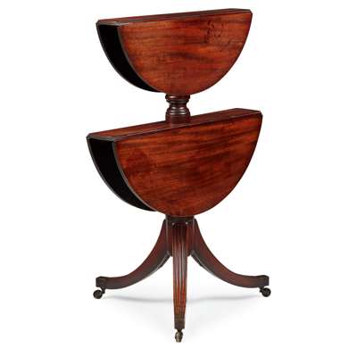 with two graduated circular tiers with drop-leaf sides with reeded edges, on a baluster column support raised on reeded sabre legs ending in brass caps and castors