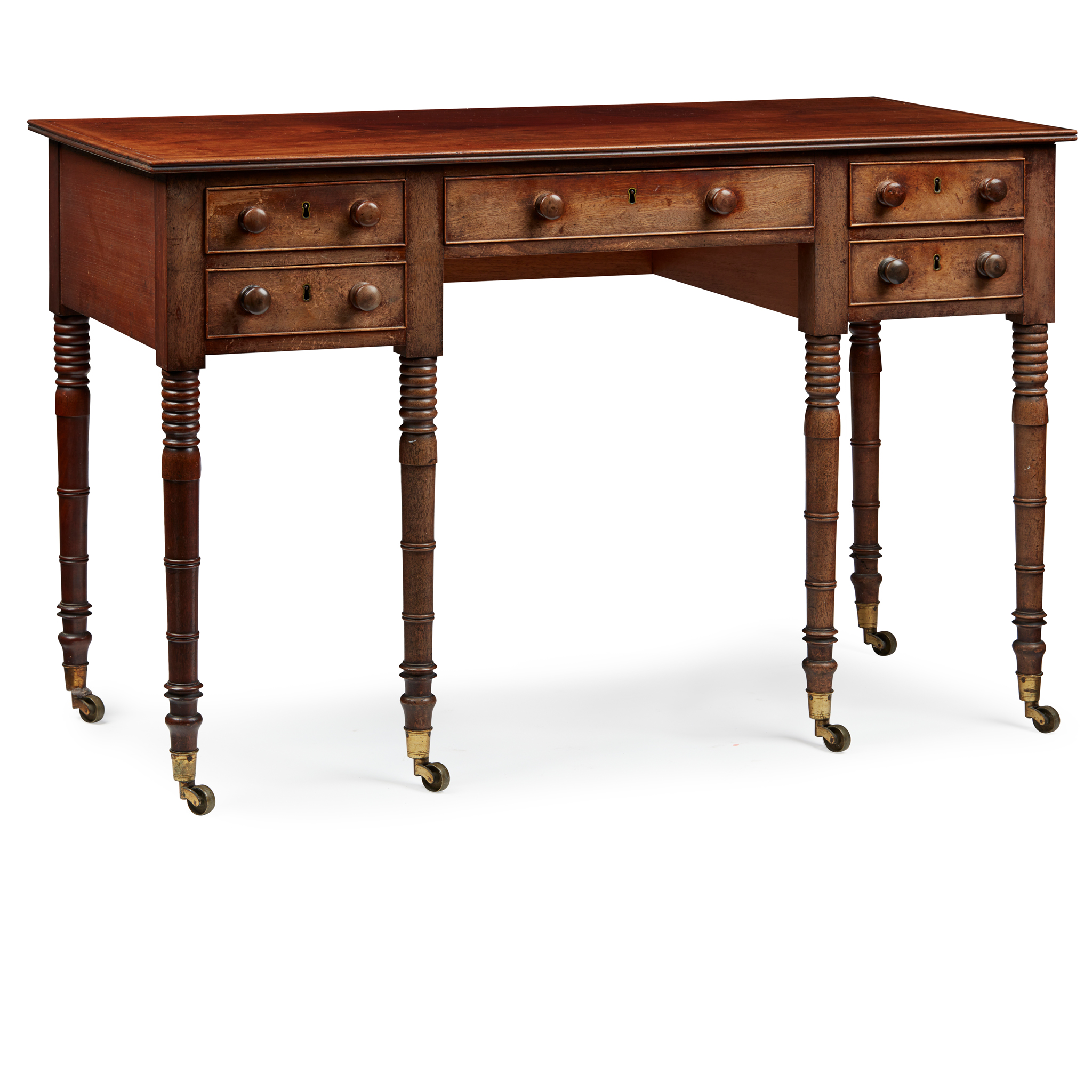 the rectangular top with banded inlay and a moulded edge, above a centre drawer flanked by banks of two short drawers, raised on ring-turned legs ending in brass caps and castors