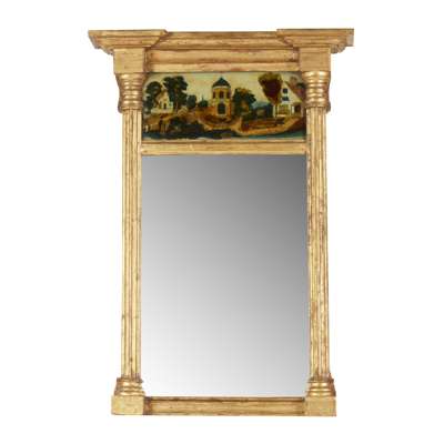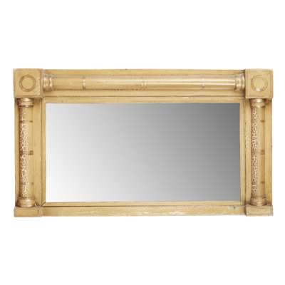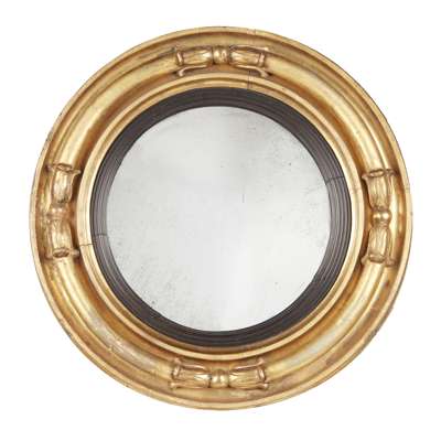 to include a pier mirror with eglomise panel and bevelled plate, 54cm x 38cm; a small overmantel mirror with column frame, 39.5cm x 69cm; and a convex mirror with an ebonised slip and lotus-clasped moulded frame, 48cm diameter (3)