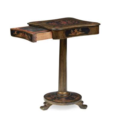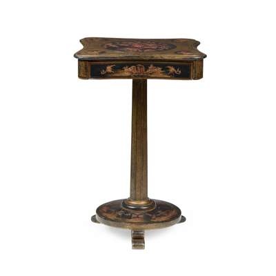 the shaped square top with Chinoiserie reserves, above a frieze drawer fitted with a writing slope and pen tray, raised on an octagonal tapered column and circular platform base with scroll feet, all decorated with Chinoiserie with gilt details