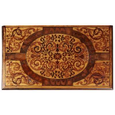 the top with a moulded edge and inlaid with strapwork and leaf scrolls within bands of oyster veneers, above two short and three long drawers with conforming marquetry, raised on small bun feet