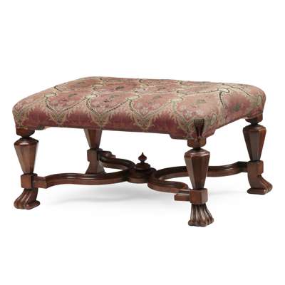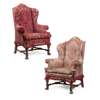 with tall arched backs with deep wings above loose cushion seats flanked by outscrolling arms, raised on facetted tapered legs ending in braganza feet and joined by stretchers; the foot stool with a rectangular seat pad raised on matching legs joined by a wavy X stretcher; in various upholstery covers with tassel trimming (3)