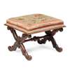 the square padded seat with flower and butterfly needlework cover with tassel trim, on neo-baroque carved X frame supports joined by a turned stretcher
