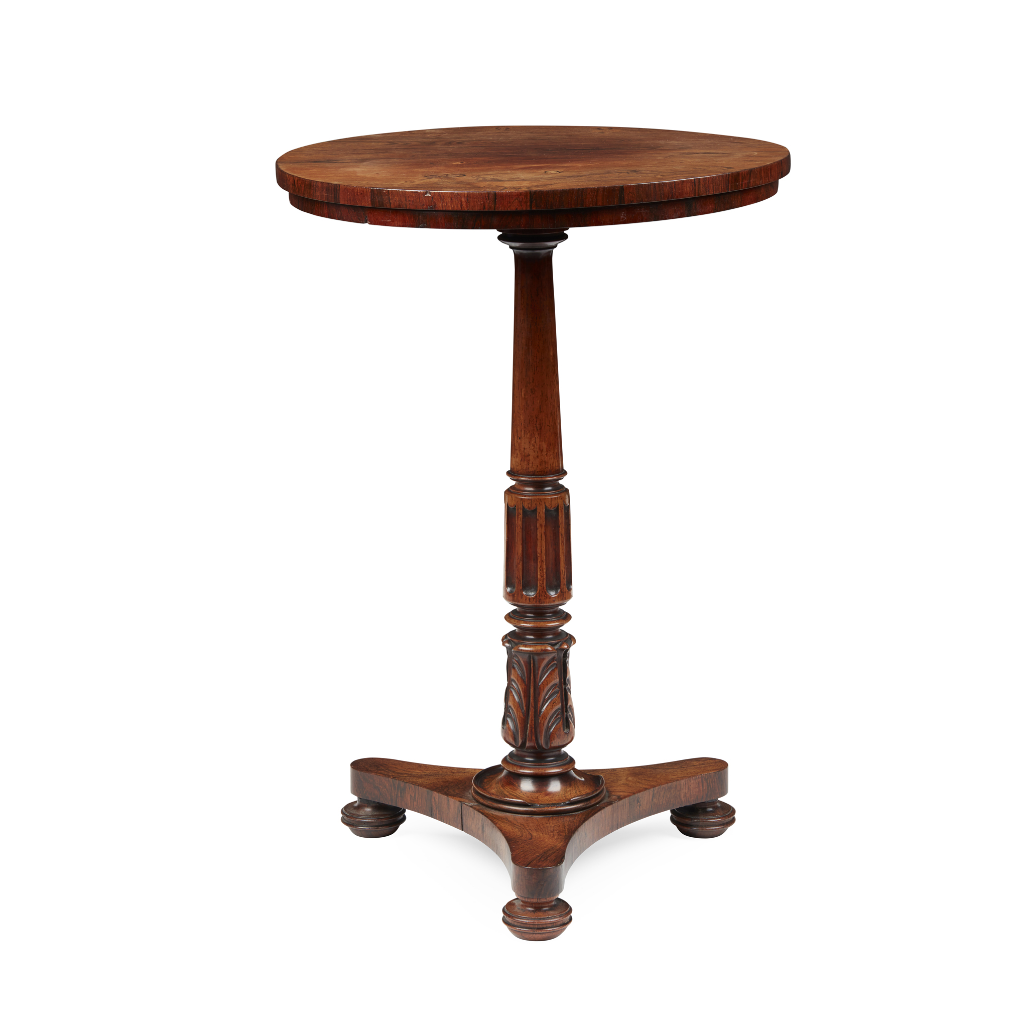 the circular top on a tapered carved column and concave triform base with squat bun feet