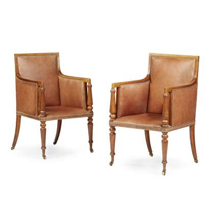 PAIR OF REGENCY STYLE OAK AND LEATHER LIBRARY ARMCHAIRS
