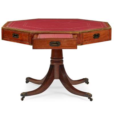 REGENCY MAHOGANY BRASS BANDED OCTAGONAL DRUM LIBRARY TABLE
