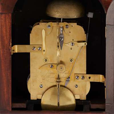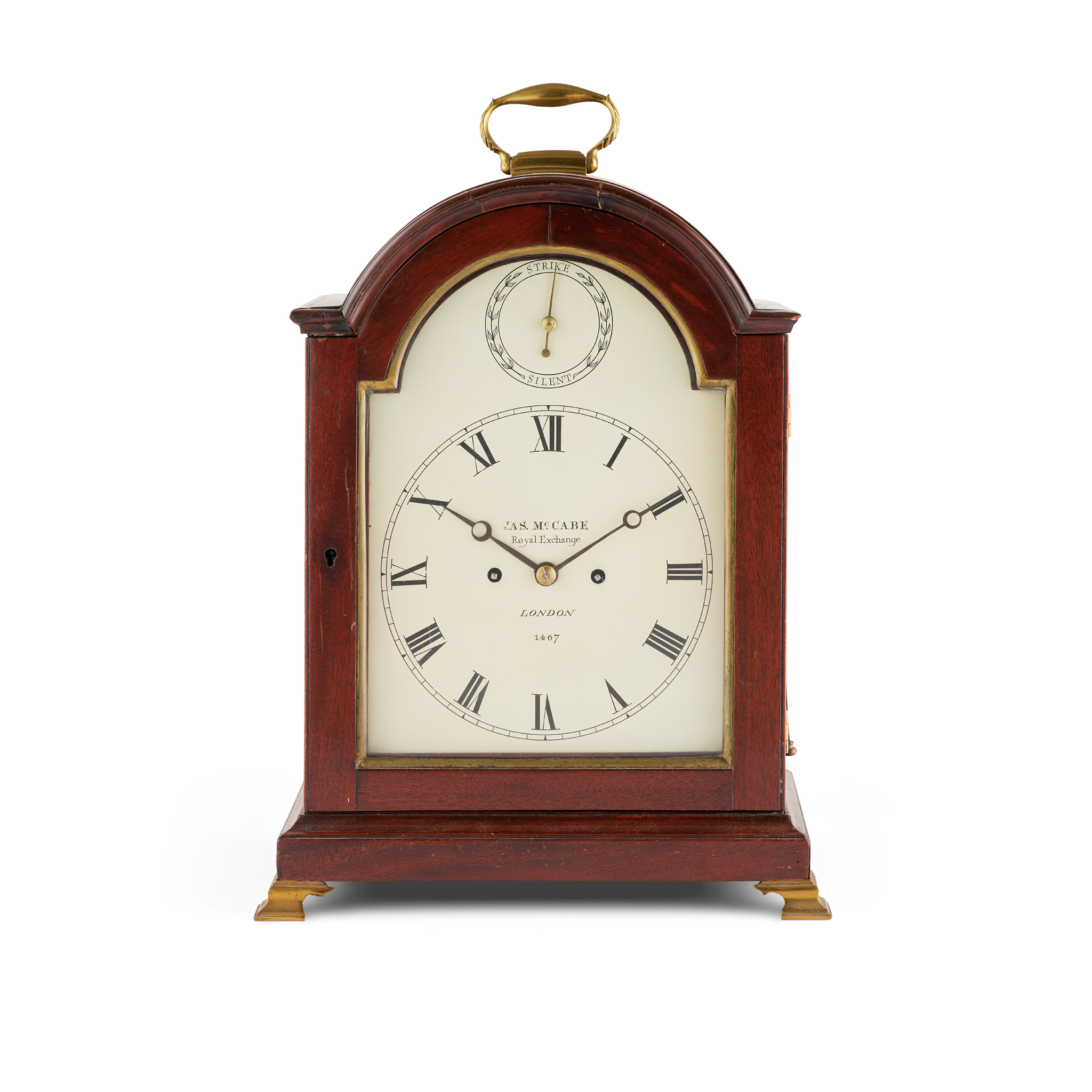 the 7 inch breakarch cream enamel dial with Roman numerals and a strike/silent subsidiary dial to the arch, signed ‘Jas McCabe, Royal Exchange, London, 1467’, the breakarch case with brass handle and moulded arch above the glazed door, with brass pierced fret panels to the sides, and a glazed back door, raised on brass bracket feet, the brass twin train chain fusée movement striking on a bell and with pull repeat, the backplate signed ‘James McCabe, Royal Exchange, London’, with brass pendulum locking nut and pull repeat cord to one side