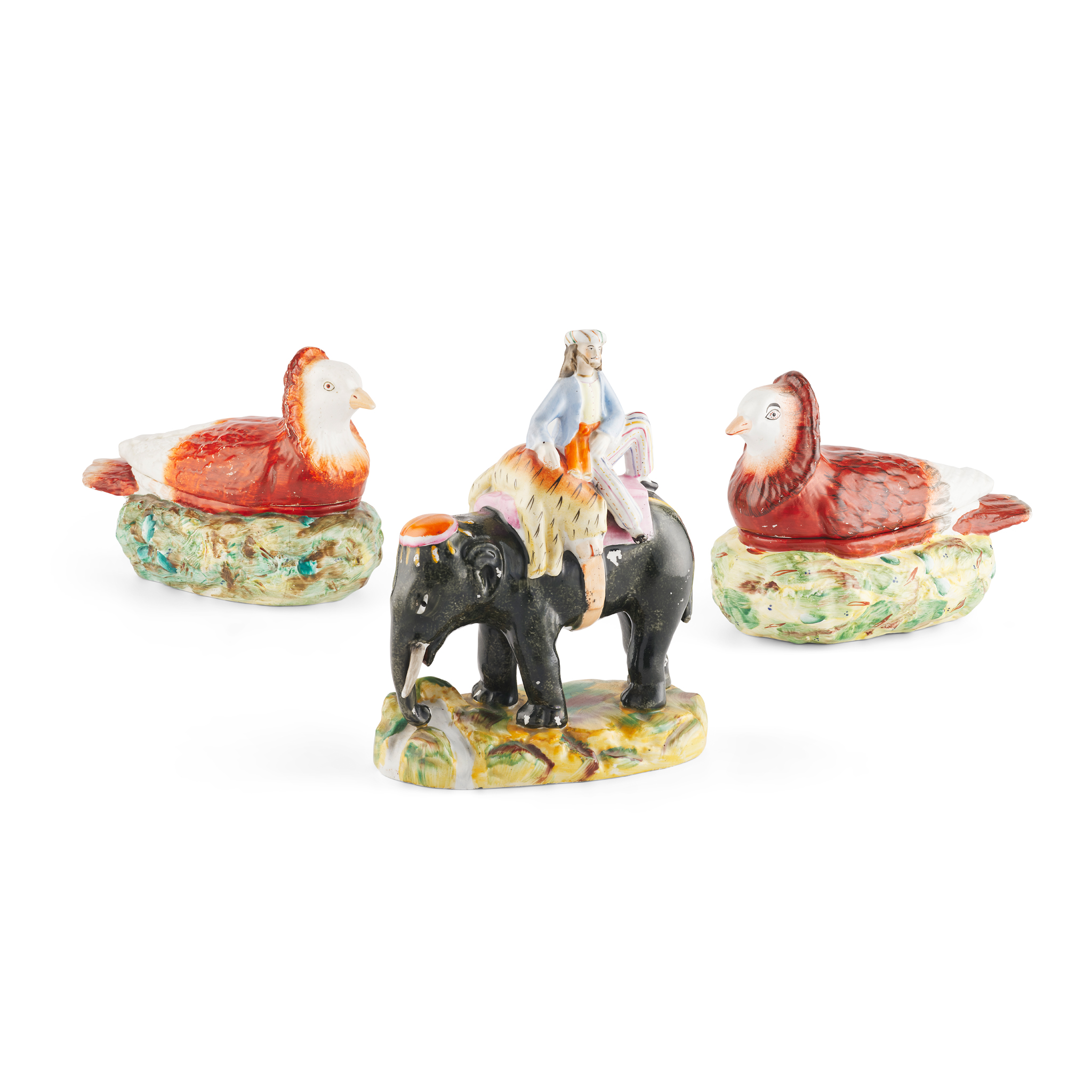 the elephant modelled standing by a stream, with a turbaned hunter and a dead tiger on his back, 22.2cm high; together with a NEAR PAIR OF STAFFORDSHIRE PIGEON TUREENS, each modelled as a pigeon on a nest (3)