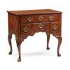 the quarter veneered and crossbanded top with a moulded edge and outlined with featherbanding, above a long frieze drawer and three short drawers arranged around a shaped apron, raised on cabriole legs ending in pad feet