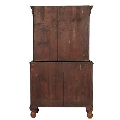 the moulded cornice above a cushion moulded long frieze drawer over a panel front opening to an arrangement of pigeon holes and drawers and fitted with a baize writing surface; the lower part with two short over two long drawers, raised on bun feet