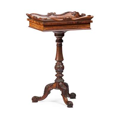 the tray top gallery carved with c-scrolls and gadrooned moulding, the top with a lift-out tray revealing a metal grill and recess, on a turned and foliate carved column with a tripod base, richly carved with acanthus scrolls