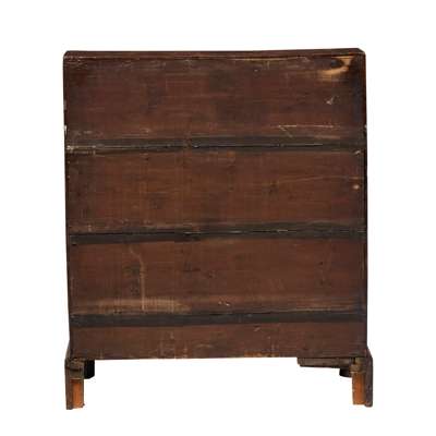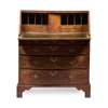 the slope front enclosing an arrangement of drawers and pigeon holes and a later black tooled leather skiver, over four graduated long drawers and a pair of lopers, raised on bracket feet