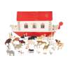the ark painted red and white with painted windows and a gable roof, one side of the roof hinged, with figures of Noah, his wife, and approximately twenty pairs of carved wood animals including zebras, rhinoceroses, giraffes, camels, elephants, tigers, leopards, ostriches, penguins, farm animals, etc. (qty)