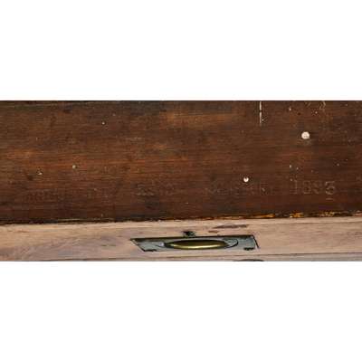 the top with a moulded edge and leather insert above a long frieze drawer raised on banks of three drawers, on turned feet, stamped on the drawer and pedestal
