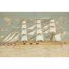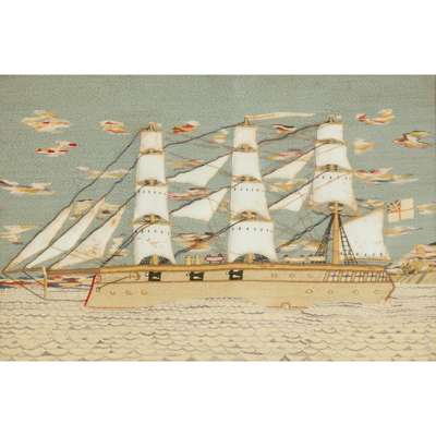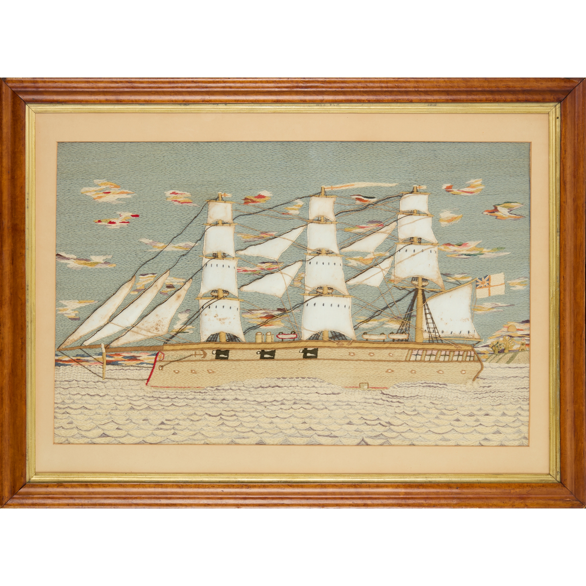 depicting a full-rigged ship with puffed woven sails and six guns, the sky with multicoloured clouds and setting sun on the right horizon line above a lighthouse and trees, the ship's spray picked out in tufted wool; in a birds' eye maple frame