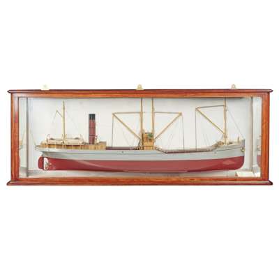 painted and fitted with rigging and hardware, in a glazed mahogany case, with ivorine plaque inscribed ‘S.S. “ARDGARVEL” & “ARDGANTOCK”, BUILT BY FERGUSON BROS. (PORT GLASGOW) LTD/ PORT GLASGOW / FOR LANG & FULTON LTD. / LENGTH, B.P. 200'-0". DEPTH MLD. TO M.D., 15'-0"/ BREADTH, MLD., 30'-0". “ ” “ Q.D., 19'-0” / 1917; the reverse with paper trade label for Hugh Macmillan, Modelmaker, 15 Cathcart Street, Greenock