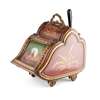 the toleware body with red and gilt japanning, shovel compartment to the rear, the hinged lid with a reverse painted glass panel with a lap dog on a cushion, with a cast scrolling handle on four white ceramic castors