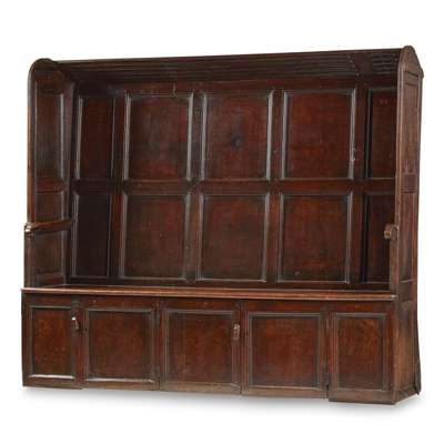 Note: This early Georgian settle includes some older 17th century oak panel sections probably repurposed from an Elizabethan or Jacobean panelled room. These include sections of a fluted pilaster on the hood and scrolled capitals for the arms.