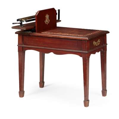 with a leather padded seat and brass and iron scale mechanism, mounted on a Georgian style frame with dummy drawer and raised on square tapering legs ending in spade feet; bearing the trade label 'W & T AVERY TRADEMARK/ ESTD. 1730/ BIRMINGHAM/ ENGLAND