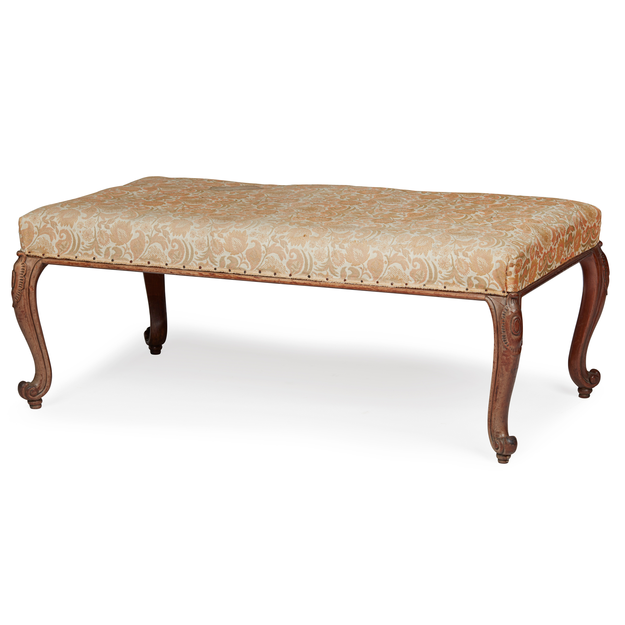 the rectangular padded seat raised on flower carved cabriole legs ending in scrolled toes, covered in yellow and gold foliate upholstery
