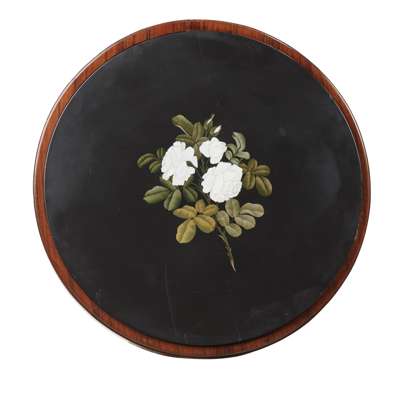 the circular inlaid slate top depicting white roses, on a lotus carved baluster column and concave triform base with square splayed feet