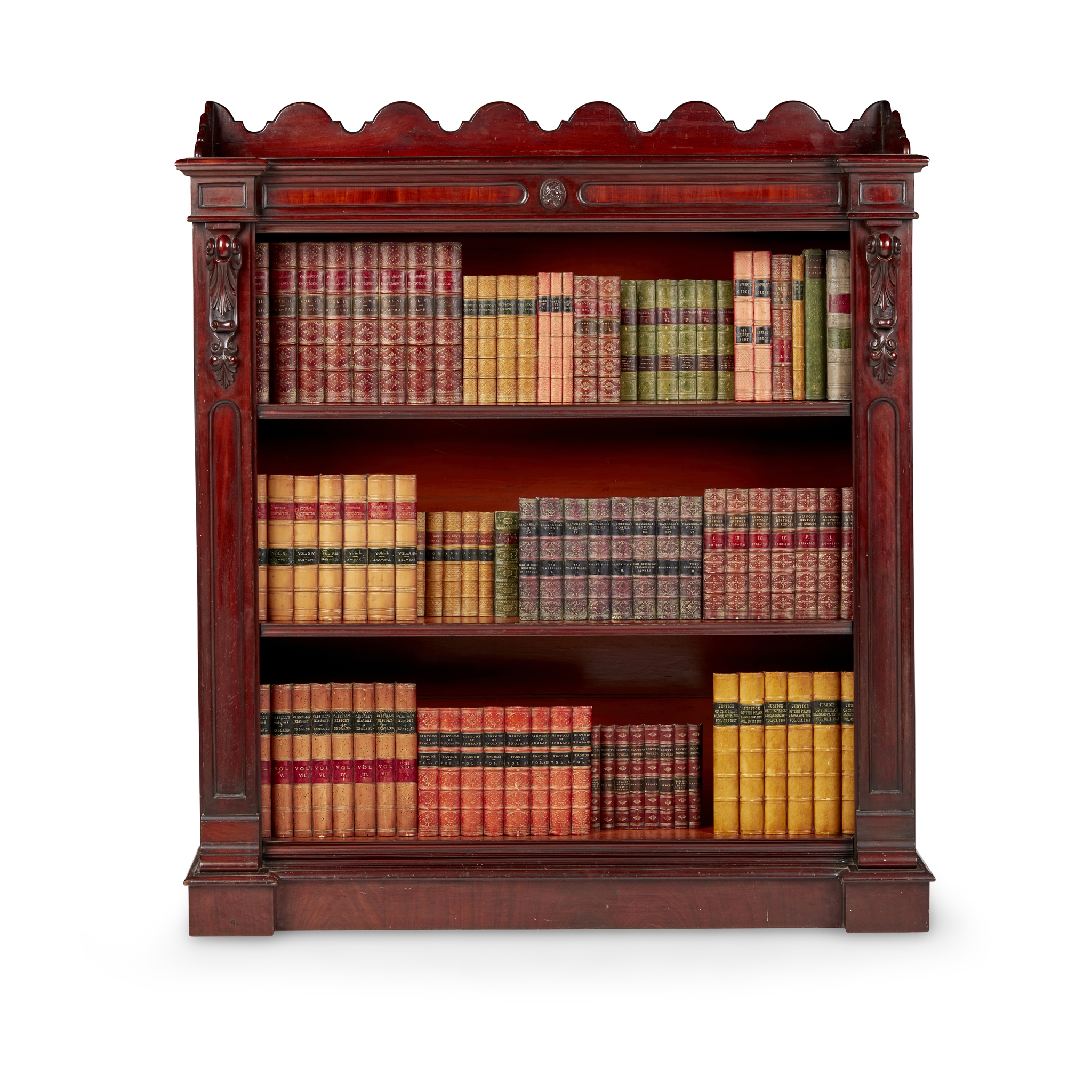 the top with a three-quarter gallery above a frieze centred by a carved classical profile, over adjustable shelves flanked by acanthus carved volutes and raised on a plinth base