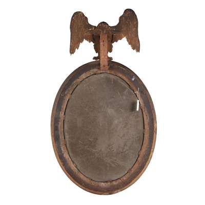 the oval mirror plate in an acanthus and palmette moulded frame with an associated carved giltwood eagle surmount